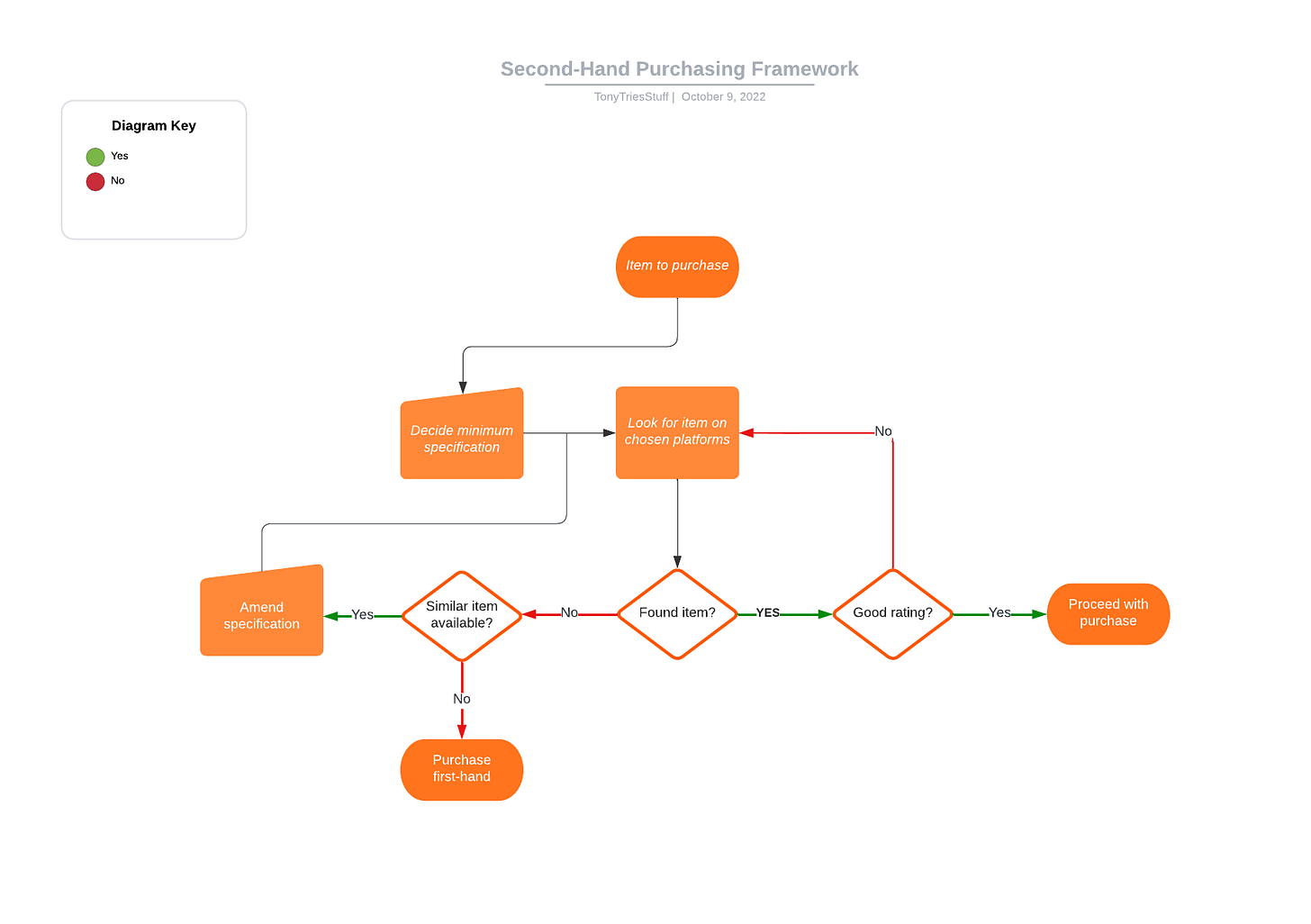 The framework is triggered by identifying an item that needs to be purchased. Once identified, you decide on a minimum specification. Once you have your minimum specification in mind, you then look for it on the platforms of your choice.